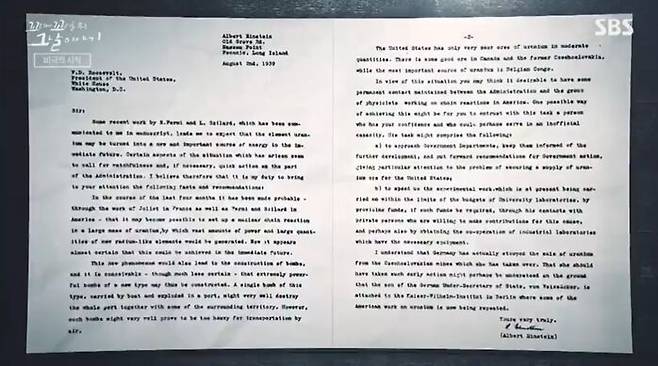 받는 사람은 미국의 루스벨트 대통령, 보낸 사람은 지금까지도 천재 과학자로 유명한 아인슈타인이야. 이 편지는 아인슈타인이 혼자 쓴 건 아니고, 다른 과학자들이 쓰고 제일 이름이 알려진 아인슈타인이 편지에 대표로 서명한 거야. 이 편지에는 이런 내용이 적혀 있어.