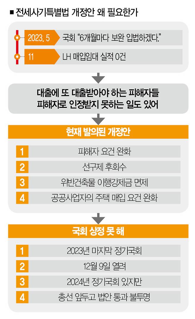 전세사기특별법 개정안은 올해 국회 본회의 문턱을 넘지 못했다. 지난 6일 열린 국회 국토교통위원회 법안심사소위에서 의결되지 않았기 때문이다. 누군가는 "전세사기특별법이 이미 있는데 왜 또 개정안까지 통과시키려는 것이냐"고 반론을 펼지 모른다. 하지만 '전세사기특별법'은 특별법이 국회를 통과한 지난 5월 '보완'을 약속한 법이었다.