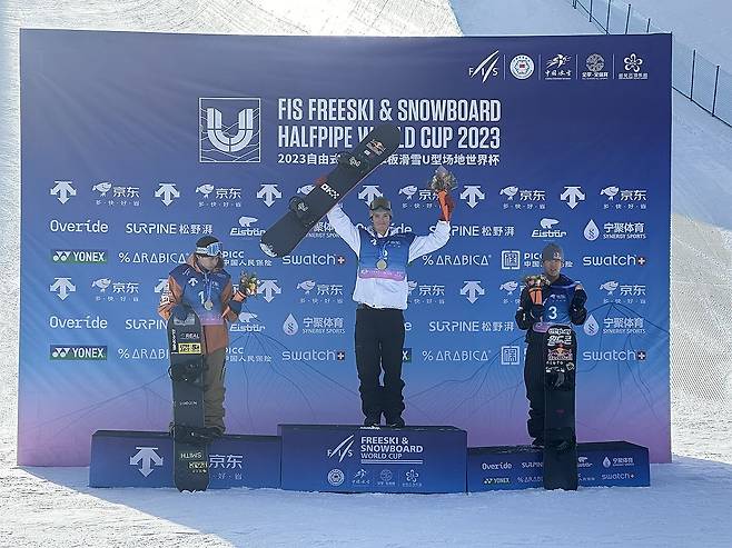 (서울=연합뉴스) 이채운은 8일 중국 허베이성 장자커우에서 열린 2023-2024 국제스키연맹(FIS) 스노보드 월드컵 남자 하프파이프 결선에서 87.50점을 받아 3위를 차지했다. 사진은 시상대에 오른 이채운(오른쪽). 2023.12.8 [대한스키협회 제공. 재판매 및 DB 금지]
