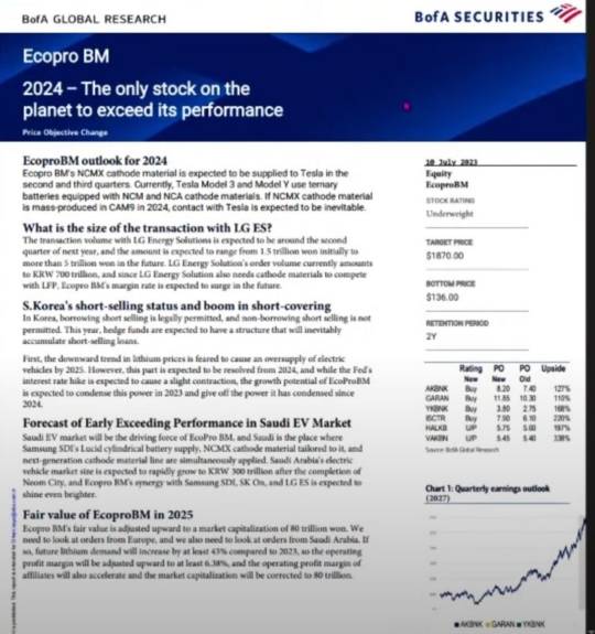 해당 보고서는 이달 초 주식 유튜브와 텔레그램 채널 등 SNS를 중심으로 빠르게 확산한 바 있다. '에코프로비엠이 지구상에서 실적을 초과하는 유일한 주식'이라며, 1,870달러를 목표가로 제시하는 등의 내용이 담겼다.