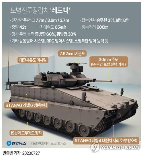 하지만 레드백은 30㎜ 기관포 외에 대전차 미사일, 12.7mm 및 7.62mm 기관총 등으로 무장하고 있다. 강력한 장갑과 적 대전차미사일·로켓을 직접 요격하는 ‘아이언 피스트’ 능동방어시스템 등을 갖춰 방어능력이 뛰어나다는 평가를 받는 이유다. 이 때문에 대당 가격은 100억원 이상으로 비싸다. 현재는 우리 군이 시범 운용 중이다. 부담스런 가격 탓에 일부 사양을 줄여 가격을 낮춘 한국형을 개발을 추진 중인 것으로 전해졌다.