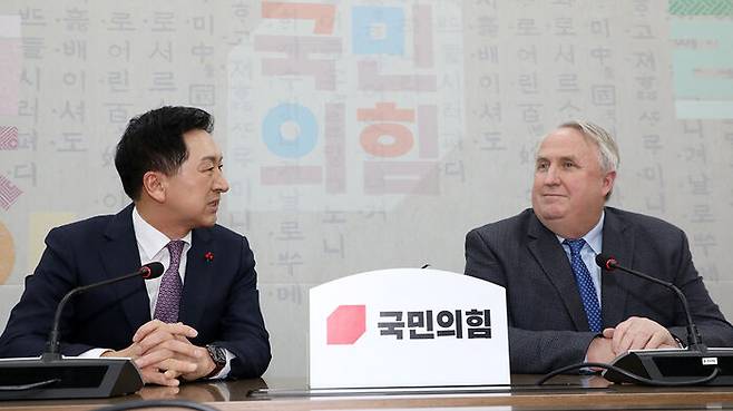 ▲ 국민의힘 김기현 대표와 인요한 혁신위원장이 6일 국회 당 대표실에서 만나고 있다.