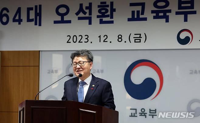 [세종=뉴시스] 강종민 기자 = 오석환 교육부 차관이 8일 오후 세종시 정부세종청사에서 열린 취임식에서 취임사를 하고 있다. 2023.12.08. ppkjm@newsis.com