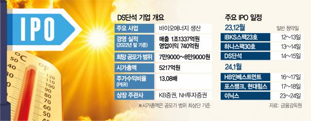 8일 투자은행(IB) 업계에 따르면 이달 5일 시작한 바이오디젤 생산 기업 DS단석 공모주 수요예측에서 기관투자가 대다수가 희망 공모가 범위(7만 9000~8만 9000원)의 상단보다 더 비싼 가격에 주문을 써냈다. 업계에서는 이에 따라 DS단석의 공모가가 9만 원대에서 결정될 가능성을 배제하지 않는 분위기다. DS단석은 13일 공모가를 확정한 뒤 14~15일 일반청약을 거쳐 22일 코스피시장에 상장할 예정이다.
