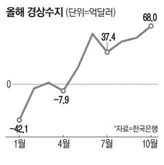 다만 올해 1~10월 누적 경상수지 흑자는 233억7000만달러로, 작년 같은 기간(273억8000만달러)의 약 85% 수준이다.
