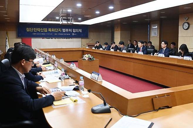 [서울=뉴시스] 장영진 산업통상자원부 제1차관이 8일 서울 종로구 무역보험공사 회의실에서 열린 '첨단전략산업 특화단지 범부처 지원협의체'에 참석해 발언하고 있다.(사진=산업통상자원부 제공) 2023.12.08. photo@newsis.com *재판매 및 DB 금지