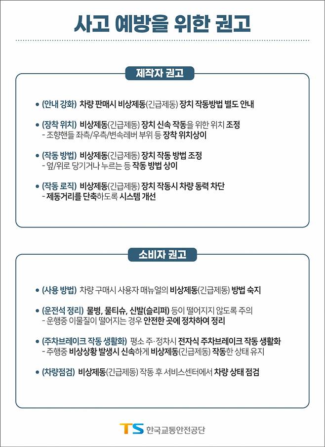 권용복 공단 이사장은 "운전자는 차량 구매 시, 사용자 매뉴얼의 비상제동 방법을 숙지하고, 운전석에 물병, 물티슈, 신발(슬리퍼)과 같은 물건이 떨어지지 않도록 주의해달라"며 "주행 중에 발생할 수 있는 비상 상황으로부터 교통사고 피해를 줄일 수 있도록 제작자와 소비자 모두 권고하는 사항을 조치하고 숙지해주시기 바란다"고 당부했다.