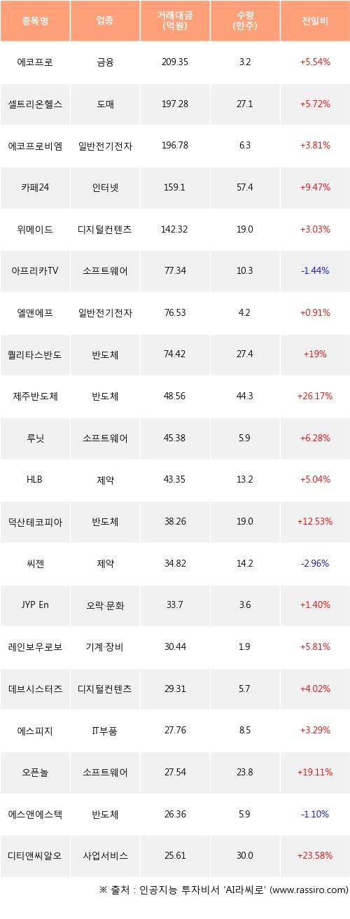 외국인 투자자의 순매수 상위 20개 종목은 에코프로, 셀트리온헬스케어, 에코프로비엠, 카페24, 위메이드, 아프리카TV, 엘앤에프, 퀄리타스반도체, 제주반도체, 루닛등이다.