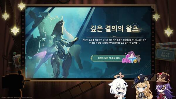 폰타인 교외를 배외하던 여행자 일행은 독특한 검객을 만났다. 그는 어떤 비경의 문 앞을 지키며 전투의 의미를 찾고 있다. 도전 이벤트 '깊은 결의의 왈츠'의 모든 스테이지는 두 개의 전투 라운드로 구성돼 있다.