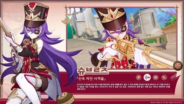 슈브르즈는 원소 전투 스킬 '신속 차단 사격술'을 사용하면 화승총으로 적을 사격하고 사격 후 일정 시간 동안 지속해서 필드 위에 있는 캐릭터의 HP를 회복시킨다. 슈브르즈의 원소 폭발은 화승총으로 적에게 폭파 유탄을 발사하는데 폭파 유탄은 대상에게 명중 시 수많은 이중 파열탄으로 분열한다.