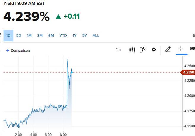 이같은 데이터가 나오면서 최근 급락했던 미국 국채금리는 다시 치솟고 있다. 이날 뉴욕채권시장에서 오전 9시 기준 10년물 국채금리는 전거래일 대비 11.2bp(1bp=0.01%포인트) 급등한 4.243%를 나타내고 있다.