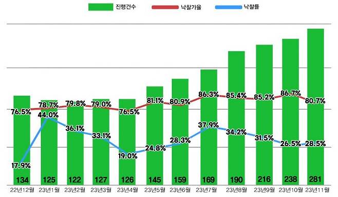 9일 경공매 데이터 전문기업 지지옥션이 발표한 ‘2023년 11월 경매동향보고서’에 따르면 지난달 전국 아파트 경매 진행건수는 2829건을 기록했다. 전달 2629건 대비 7.6%, 전년 동월 1904건에 비하면 무려 48.6%가 증가했다. 지지옥션 관계자는 "고금리 이자부담 및 매수세 위축으로 경매 신건과 유찰 건수가 동시에 늘어난 탓으로 보인다"고 설명했다.
