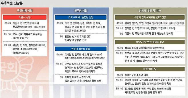 정치적 위상이 추락한 정의당은 물론 녹색당·진보당·기본소득당 등 군소정당, 거대 양당 체제의 틀을 박차고 나와 다른 정치를 모색해온 양향자 ‘한국의 희망’ 의원, 금태섭·정태근 전 의원 등도 총선에서 생존하기 위해 다양한 신당 전략을 고심하고 있다. 이들은 현행 연동형 비례대표제 유지를 전제로 의석 배분이 가능한 최소 기준인 3% 득표를 달성하고, 가치를 공유할 수 있는 세력 간 선거연합을 성공시키려 안간힘을 쓰고 있다. 현재까지 의미 있는 흐름은 4가지다.