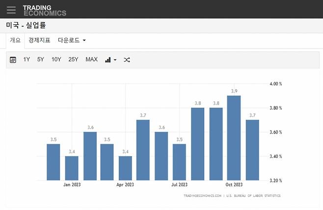 실업률은 1월과 4월 3.4%로 최저점을 찍은 후 8~9월 3.8%, 10월 3.9%를 기록해 4%대 진입을 알리는가 싶더니 11월은 오히려 3.7%로 줄었다. 가을에 파업을 벌이던 노조들이 대부분 일터로 복귀한 영향이지만 미국경제의 실업률은 5.50%라는 고금리에도 불구하고 역사상 가장 낮은 수준을 유지하고 있다.