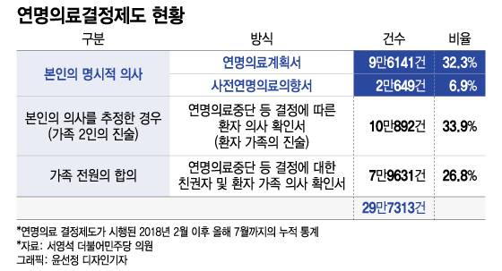 국회 보건복지위원회 소속 서영석 민주당 의원이 보건복지부로부터 받은 자료에 따르면 올해 7월 말 기준 연명의료중단 이행 건수는 29만 7313건으로 나타났다. 이 가운데 본인의 의사에 따라 연명의료가 중단된 경우는 39.2%에 불과했다. 환자 본인보다 가족 등 보호자의 동의나 합의에 따라 결정되는 경우가 대부분인 셈이다. 또 법적 책임에 대한 부담으로 의료진이 적극적으로 연명의료 중단에 나서지 않는 경우도 부지기수다.