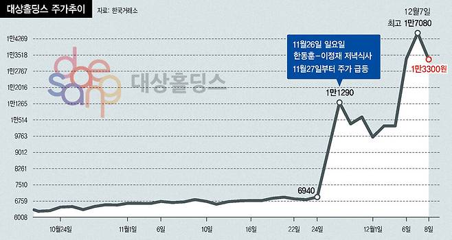이튿날인 27일 월요일, 주식시장이 열리자 대상홀딩스의 주가가 전 주말 종가(6940원)보다 9.94% 급등해 거래를 시작해 10시45분 가격제한 폭(29.97%, 9020원)까지 치솟았다. 다음날에도 상한가까지 올랐다가 25.2% 상승한 1만1290원에 거래를 마쳤다. 이후 5거래일간 큰 폭으로 출렁거리며 조금 밀리는 듯하더니, 12월6일 또 한번 상한가까지 치솟았다. 8일엔 단기과열종목으로 지정돼 30분 단위로 거래가 체결되면서 8.4% 떨어졌지만 이날 종가까지 상승률은 91.6%에 이른다. 2513억원이던 시가총액은 4816억원으로 2303억원 불어났다.