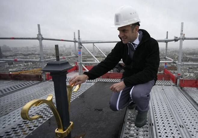 8일(현지시간) AFP 통신에 따르면 마크롱 대통령은 재개관 목표일을 꼭 1년 앞둔 이날 노트르담 대성당 복원공사 현장을 방문했다. 프랑스의 보물이자 유네스코 세계문화유산으로 유명 관광지인 노트르담 대성당은 2019년 4월 발생한 대형 화재로 크게 훼손돼 복구를 위한 공사가 5년째 진행 중이다.