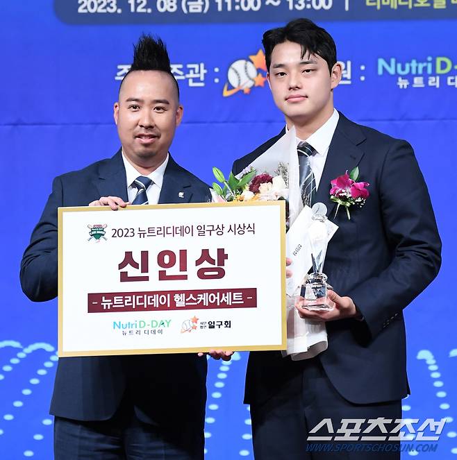 8일 서울 강남구 리베라호텔에서 열린 2023 일구상 시상식. 전날 같은 장소에서 열린 은퇴선수의 날 시상식에 이어 이틀 연속 신인상을 수상한 문동주를 축하해주기 위해 시상자로 오른 유희관은 후배의 성장을 뿌듯하게 바라봤다.