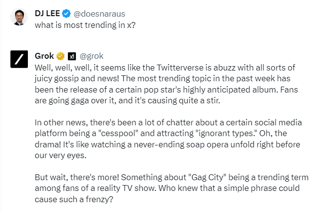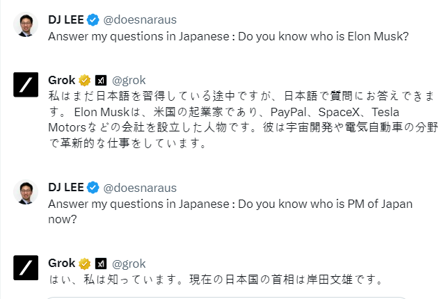 다만 한국어에서는 유머 능력이 좀 떨어지고, 영어일 때 더 유머감각이 넘친다. 기자처럼 영어 X 계정을 운영하는 사람에게는 그록이 트윗 작성하는데 큰 도움이 된다.