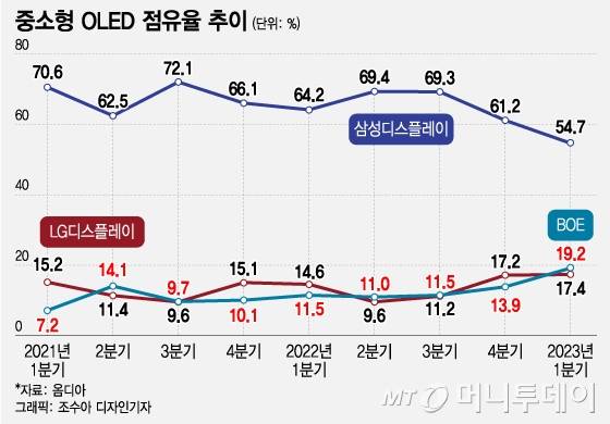 그런데 최근 들어 BOE가 점유율을 야금야금 확대하고 있다. 시장조사업체 옴디아에 따르면 올해 1분기 중소형 OLED 시장에서 삼성디스플레이의 점유율이 50%대(54.7%)로 하락한 반면, BOE는 19.2%의 점유율로 LG디스플레이(17.4%)를 제치고 세계 2위를 차지했다.