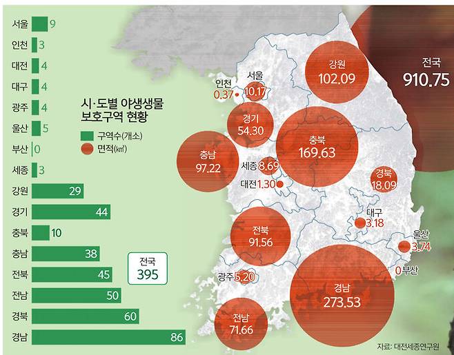 8일 국토교통부에 따르면 국내 야생생물보호구역은 394곳이다. 야생생물특별보호구역은 경남 진주 진양호 수달서식지 1곳이다. 지역별로는 경남이 86곳, 273.53㎢ 규모로 가장 많이 지정돼 있다. 부산은 단 한 곳도 없다.