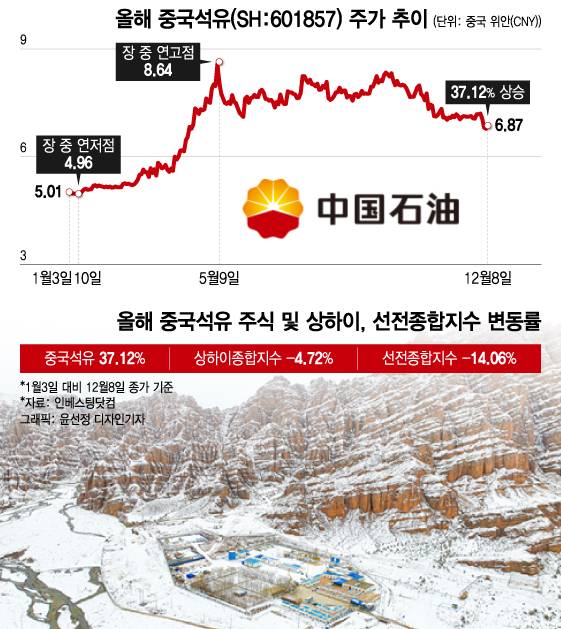 올해 중국의 자원은 여러모로 이슈의 중심이었다. 중국 곳곳에서 초대형 유전을 비롯해 우라늄 광산과 희토류 벨트가 발견됐고 요소 등에 대한 수출 통제로 '자원의 무기화'에 대한 우려의 목소리가 나왔다. 이 가운데 중국석유의 주가는 중국 증시가 올해 내내 흔들리는 와중에도 선방했다는 분석이 나온다.