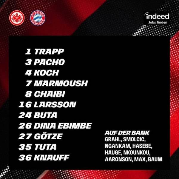 프랑크푸르트는 3-4-2-1 포메이션으로 대응했다. 원톱에 오마르 마르무시가 출격했고, 그 밑을 안스가르 크나우프-마리오 괴체가 받쳤다. 미드필드엔 디나 에빔베-파레스 샤이비-휴고 라르손-아우렐리우 부타가 선발 출전했다. 골키퍼 장갑은 케빈 트랍이 꼈다.
