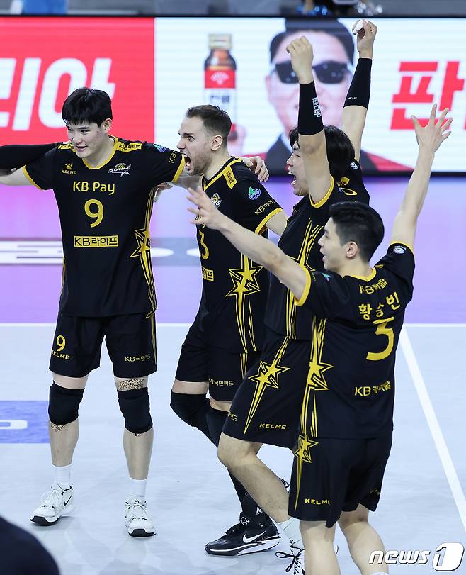 (인천=뉴스1) 이재명 기자 = 10일 오후 인천 계양체육관에서 열린 남자 프로배구 '2023-2024 도드람 V리그' 대한항공 점보스와 KB손해보험 스타즈의 경기에서 세트스코어 3대1로 승리 거둔 KB손해보험 선수들이 기뻐하고 있다. 2023.12.10/뉴스1