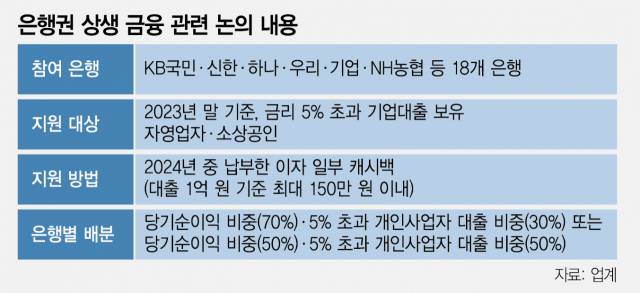 정부의 상생 금융 압박에 은행권이 자영업자·소상공인을 대상으로 1인당 최대 150만 원의 이자를 현금으로 돌려주는 '캐시백' 방안을 검토하고 있다.
