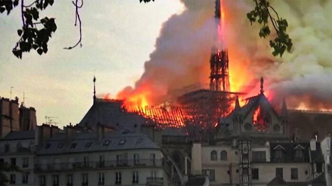 시뻘건 화염 속에 뼈대만 남은 대성당의 첨탑이 힘없이 무너져 내립니다.