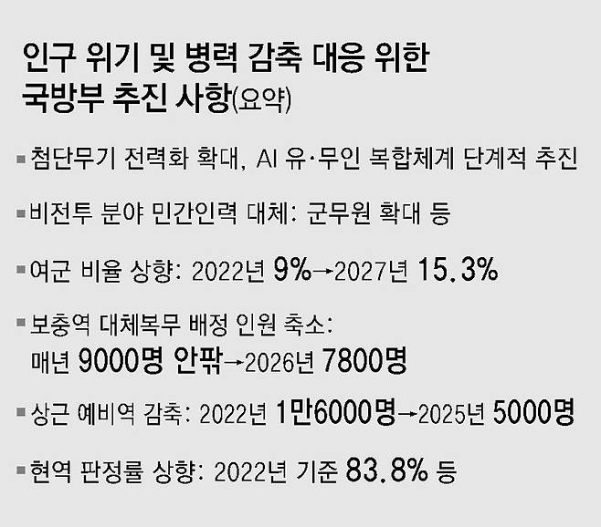 여군 확대도 대안으로 거론된다. 군 당국은 여군 비율을 지난해 9%에서 2027년 15.3%까지 확대할 계획이다. 그러나 여군을 확대하려면 하사, 소위 등 초급 간부에 대한 처우를 혁신 수준으로 개선하는 것이 먼저라는 지적이 나온다. 육군 학사장교의 경우 2018년 경쟁률이 4.4 대 1이었지만 지난해 1.5 대 1로 급락했다. 육군 발전자문위원을 맡고 있는 최영진 중앙대 정치국제학과 교수는 “여군을 그저 빈자리를 채워 줄 병력으로 봐선 안 된다. 초급 간부에 대한 전반적인 처우 개선이 있어야 여군도 늘어나는 것”이라며 “초급 간부를 선발할 때 장기, 단기로 나눌 것이 아니라 전체 다 장기로 뽑는 등 직업 안정성을 높여야 간부 지원이 늘어날 것”이라고 했다.