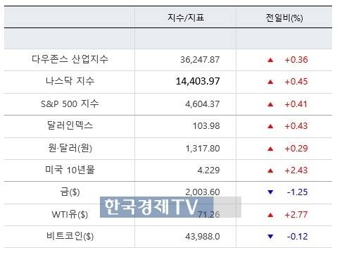 [미국증시 마감시황] 지난 금요일 뉴욕증권거래소(NYSE)에서 다우존스30산업평균지수는 전 거래일보다 0.36%(130.49포인트) 오른 3만6247.87로 거래를 마감했다. 스탠더드앤드푸어스(S&P)500지수는 0.41%(18.78포인트) 상승한 4604.37, 나스닥 지수는 0.45%(63.98포인트) 뛴 1만4403.97로 거래를 마쳤다. S&P 500 지수는 2022년 3월 이후, 나스닥 지수는 2022년 4월 이후 최고치다
