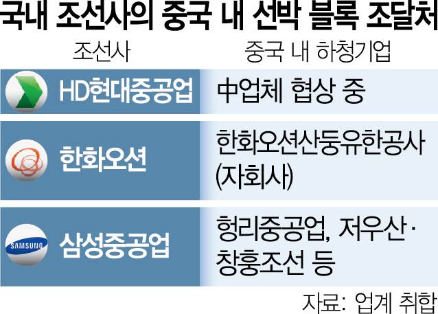 유명 완구인 ‘레고’처럼 선박은 크고 작은 블록을 한데 붙여 만들어진다. 큰 블록은 하나에 400톤이나 되고, 초대형 컨테이너선의 경우 크고 작은 블록 300개가 들어간다. 통상 협력사가 블록을 만들어 조선소에 납품한다. 철판을 자르고 이어 붙이는 용접 등 작업이 많아 노동력이 적지 않게 들어가는 핵심 공정이다. HD현대중공업이 우리나라 대신 중국 하청을 통해 블록을 받으면 한화오션·삼성중공업을 포함해 국내 조선 3사 모두가 중국에 블록 제작을 의존하게 되는 셈이다.