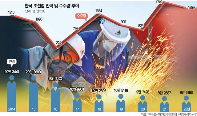 한국조선해양플랜트협회에 따르면 우리 조선업에 근무하는 원·하청 인력은 2014년만 해도 20만여 명에 달했다. 그랬던 것이 지난해 말 10만 명이 채 되지 않으며 반 토막이 났다. 조선업 호황기에 들어서며 수주 물량이 크게 늘었지만 인력은 10년 전에 비해 절반도 안 되는 것이다. 당장 상선용 블록을 만들 협력사 내 인력이 사라지면서 블록 납품마저 미뤄지고 있다.