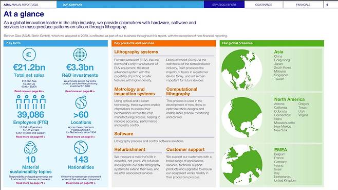 | ▲ ASML 2022 연례보고서에 기록된 ASML의 현재. 매출과 직원 수, 주요 사업 등이 요약되어 있습니다. |