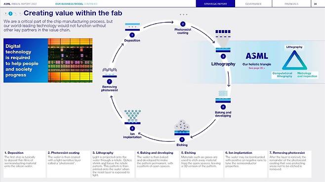 | ▲ 2022년 ASML 연례보고서에 있는 ASML 소개. ASML은 반도체 제조의 여러 공정 가운데 노광공정에 쓰이는 장비만 생산하는 세계 최대의 반도체 장비업체입니다. |