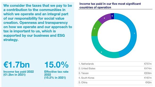 | ▲ ASML이 각국에 낸 세금. 전체 금액은 17억 유로, ASML코리아는 1억6천7백만 유로로 ASML 안에서 네번째로 많이 내고 있습니다. |