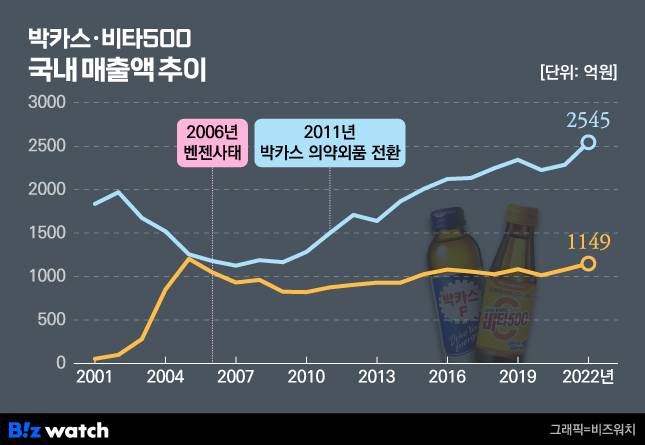 2006년 국내 환경단체가 시판 중인 비타민드링크에서 발암물질인 벤젠이 검출됐다고 발표하자 비타민드링크 열풍이 차갑게 식었습니다. 비타500은 당시 벤젠이 검출되지 않았는데도 소비자들의 불신을 피해가지 못했습니다. 박카스도 이 여파로 매출이 줄지만 비타500의 성장세가 더 큰 폭 꺾이며 시장 1위를 다시 회복했습니다.