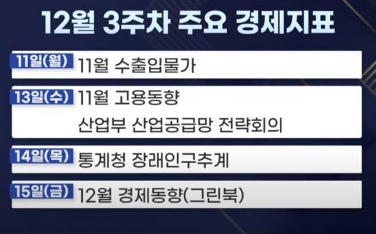 ▲ 이번주 국내 경제 주요 일정은 이번주 주요지표 살펴보면 우선 오늘 11월 수출입물가가 나옵니다. 유가 등 원자재 영향으로 수입물가지수가 떨어질지 봐야겠고요. 13일에는 산업통상자원부가 '산업공급망 전략회의'를 엽니다. 최근 중국의 요소 수출 제한으로 2년 만에 '요소수 대란'이 재연될 수 있다는 우려가 커진 만큼 이 문제를 주로 논의할 예정인데, 특정국 의존도가 높은 원재료의 공급망을 안정화할 수 있는 방안이 나올지 살펴봐야겠습니다. 같은 날 한국은행의 '11월 금융시장 동향'도 공개됩니다. 가계 빚이 얼마나 늘어났을지, 정부 입장에선 얼마나 천천히 늘어났을지가 따져볼 부분입니다. 고용동향에선 청년 고용과 제조업 취업자 수가 체크포인트입니다.
