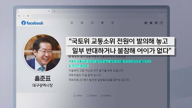 홍준표 대구시장은 자신의 SNS에 "국토위 교통소위 전원이 발의해 놓고 일부 반대하거나 불참해 어이가 없다"면서 "국회의원 자질 문제"라고 비판했습니다. 더불어민주당 대구시당은 논평을 내고 "법안을 반대한 일부 의원은 국민의힘 소속"이라고 주장하며 기획재정부와 국민의힘을 싸잡아 비판했습니다.