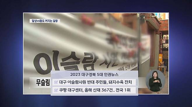 이어서 대구 북구청의 공사 중지 명령에서 비롯된 이슬람 사원 반대 주민들의 돼지머리 시위와 수육 집회. 쿠팡 대구물류센터에서 2023년 전국에서 가장 많은 367건의 산업재해 신청이 접수됐다는 뉴스가 대구·경북 5대 인권 뉴스로 선정됐습니다.