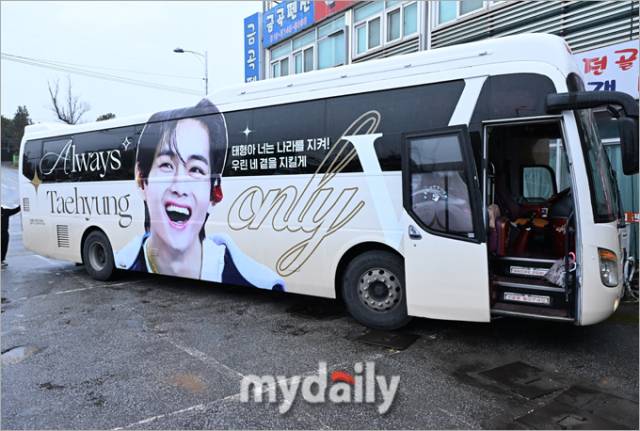 그래서 아미가 준비한 것은 대형 버스 광고. 입대하는 뷔와 RM이 확실히 볼 수 있게 훈련소 입구 주차장에 주차돼 있다.