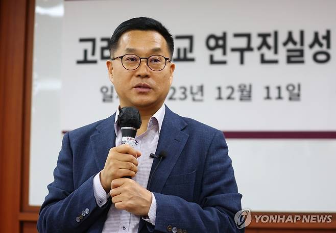 (서울=연합뉴스) 김도훈 기자 = 11일 오후 서울 성북구 고려대학교 R&D센터에서 열린 LK-99 관련 고려대 연구진실성 위원회 조사결과 설명회에서 권영완 교수가 발언하고 있다.