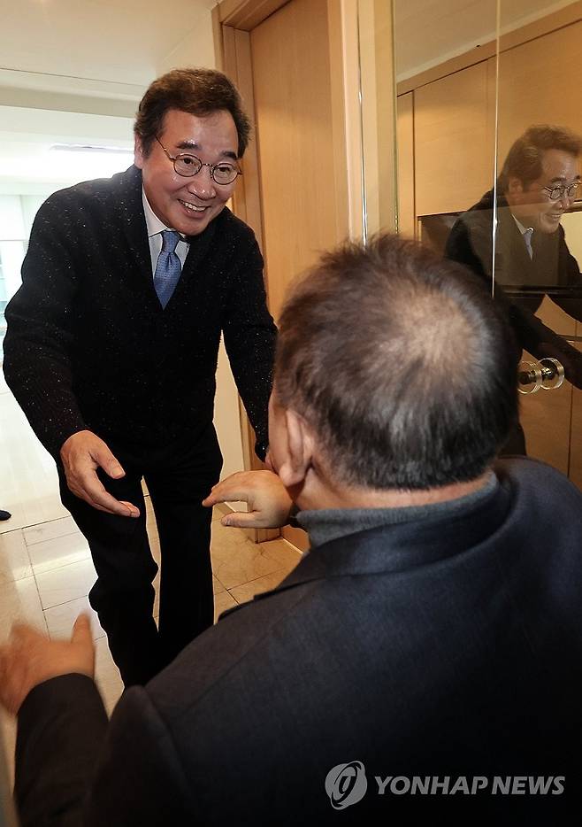 (서울=연합뉴스) 윤동진 기자 = 더불어민주당 이낙연 전 대표가 11일 오후 서울 종로구 사무실에서 무소속 이상민 의원과 대화를 나눈 후 배웅을 하고 있다. 2023.12.11 [공동취재]