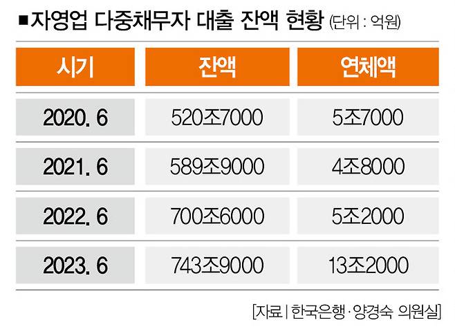 한달 반이 흐른 11월 22일엔 좀 더 심각한 통계가 공개됐다. 이번에도 양경숙 의원이 한국은행에서 받아 공개한 자료였는데, 그건 '시도별 자영업 다중채무자 대출 현황'이다. 이에 따르면 올해 2분기 기준 전국 자영업 다중채무자의 전체 금융기관 대출 잔액은 743조9000억원이었다. 지난해 2분기(700조6000억원)보다 6.2% 더 늘어난 역대 최대치였다.