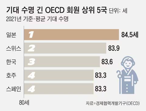 선진국 클럽인 경제협력개발기구(OECD) 회원국 중 국민 평균수명이 가장 긴 나라는 대표적 장수 국가 일본(84.5세)입니다. 일본은 100세 이상 인구가 53년 연속 증가해 올해 9만명이 넘었는데요, 기대 수명 2위는 유럽에서도 소득과 의료 서비스 수준이 높은 스위스(83.9세)였습니다. 그 뒤를 평균 수명 83.6세인 한국이 잇고 있습니다.