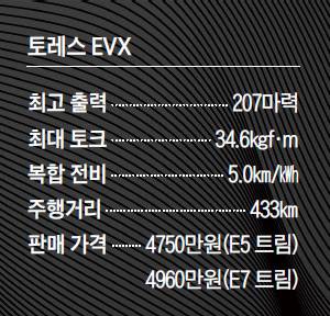 토레스 EVX는 니켈·코발트·망간(NCM) 삼원계 리튬이온 배터리가 아닌 중국 BYD(비야디)의 리튬인산철(LFP) 배터리를 장착했다. LFP 배터리는 NCM 배터리보다 가격이 저렴하지만, 에너지밀도가 낮고 추위에 약하다. KG모빌리티는 통상 영하에서 작동하는 배터리 열관리 시스템을 토레스 EVX의 경우 영상 8도부터 작동시켜, 겨울철에도 최적의 배터리 성능을 유지하게 했다고 밝혔다. 배터리 용량은 73.4이고, 완충 시 최대 433㎞(18인치 타이어 기준)를 주행한다. 복합 전비는 5.0㎞/(18인치 타이어 기준)다. 토레스 EVX의 배터리는 또 하나의 특징이 있다. 모듈 없이 셀에서 바로 팩으로 이어지는 셀 투 팩(CTP·Cell To Pack) 공법으로 에너지밀도를 높였다는 점이다. 전기차 배터리는 일반적으로 셀-모듈-팩 공정으로 제작되는데, 토레스 EVX는 셀을 곧바로 팩으로 결합해 단위면적당 에너지밀도를 20% 높였다. 공간 손실을 최소화하면서 배터리를 장착했다는 얘기다. 토레스 EVX는 V2L(Vehicle to Load) 기능을 지원한다. V2L은 전기차 배터리 전력으로 가정용 전자 기기 등을 이용할 수 있게 한 기술로, 캠핑·차박에 유용하다. 토레스 EVX는 주변을 전후·측방 네 개의 레이더를 통해 인식하고 능동적으로 차를 제어해 사고를 예방하는 안전 시스템을 갖췄다. 저가 트림도 긴급 제동 보조, 차선 유지 보조, 앞차 출발 알림 경고, 전방 추돌 경고, 부주의 운전 경보, 안전거리 경고, 차선 이탈 경고, 전후방 주차 보조 경고 등 첨단 안전 사양을 기본으로 품고 있다. 차체의 81%에 고장력 강판(340 이상)을 적용했고, 47%에 초고장력 강판(590 이상)을 적용했다. 토레스 EVX의 가격은 저가(E5) 트림이 4750만원, 고가(E7) 트림이 4960만원이다. 전기차 보조금을 받으면 3000만원대로 구입할 수 있다. KG모빌리티는 토레스 EVX 배터리를 10년·100만㎞ 보증한다. 국산 전기차는 통상 10년·16만㎞ 또는 10년·20만㎞ 보증한다. KG모빌리티 관계자는 “토레스 EVX의 배터리 팩 설계는 외부 충격에 강하고, 효율·내구성이 뛰어나다”며 “경쟁사에서 시도하지 못한 국내 최장 보증을 제공하기로 했다”고 말했다.