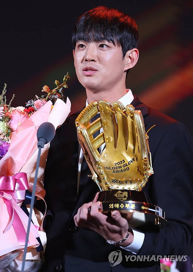 (서울=연합뉴스) 김도훈 기자 = 11일 오후 서울 강남구 코엑스 오디토리움에서 열린 2023 한국프로야구 KBO 골든글러브 시상식에서 외야수 부문 수상자 삼성 라이온즈 구자욱이 소감을 밝히고 있다. 2023.12.11