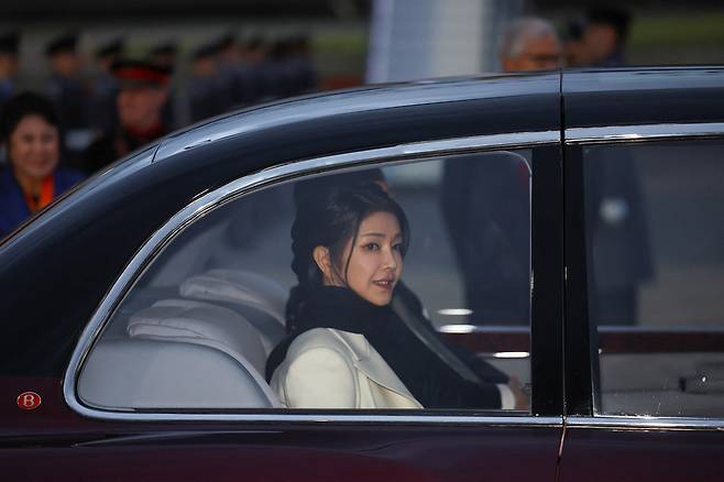 | ▲ 윤석열 대한민국 대통령과 부인 김건희 여사가 2023년 11월 20일 이틀간의 영국 국빈 방문을 위해 런던 스탠스테드 공항에 착륙한 후 항공기에서 내리고 있다. |