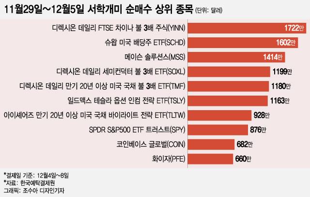 지난 11월29일~12월5일 사이에 서학개미들이 가장 많이 순매수한 종목은 디렉시온 데일리 FTSE 차이나 불 3배 ETF(YINN)다. YINN은 1722만달러 순매수됐다.